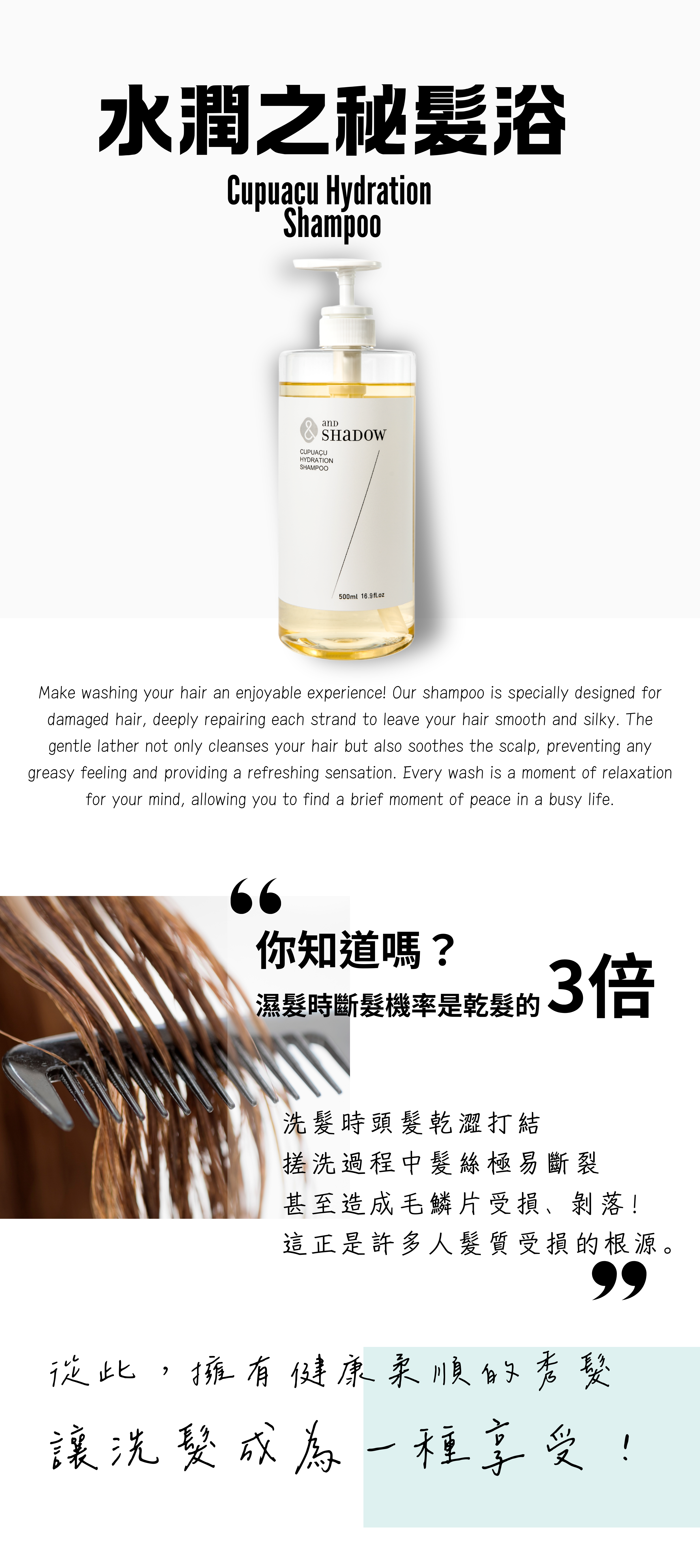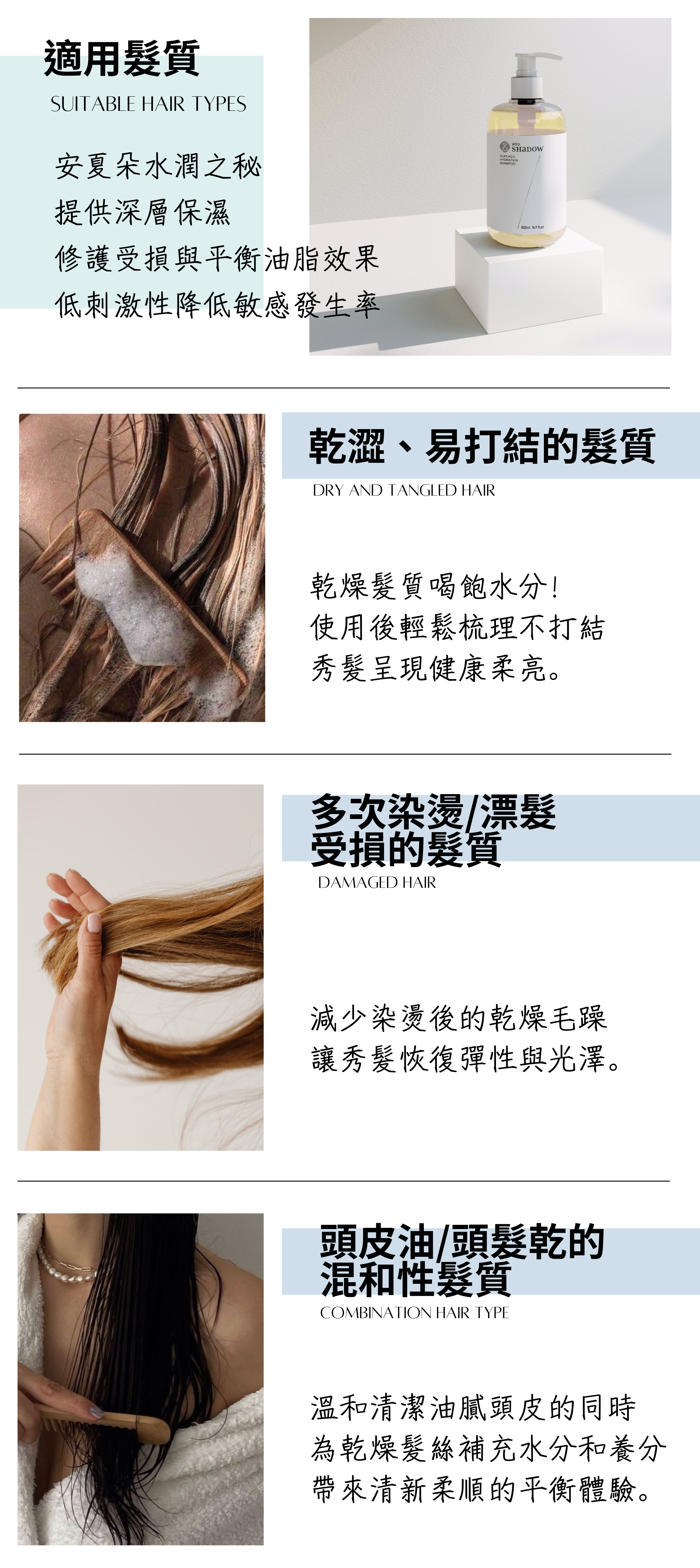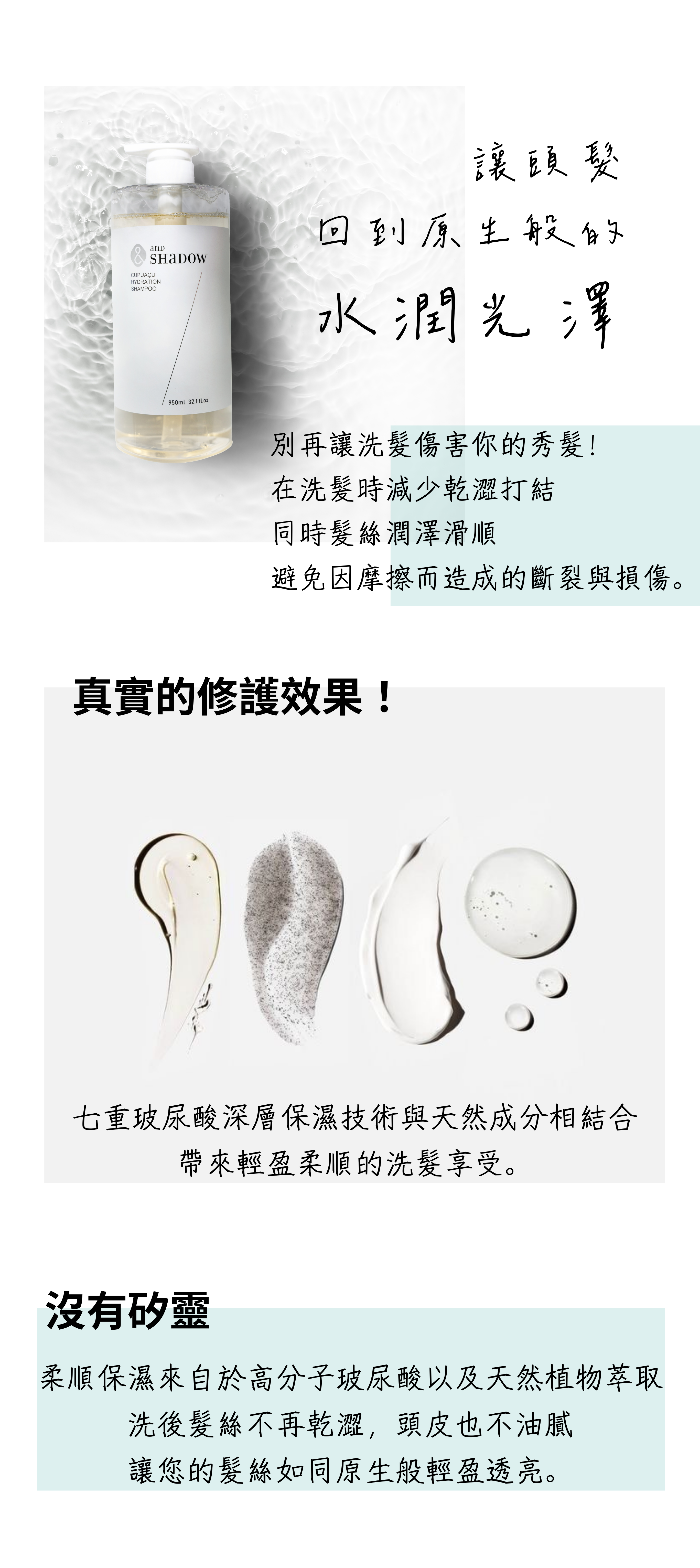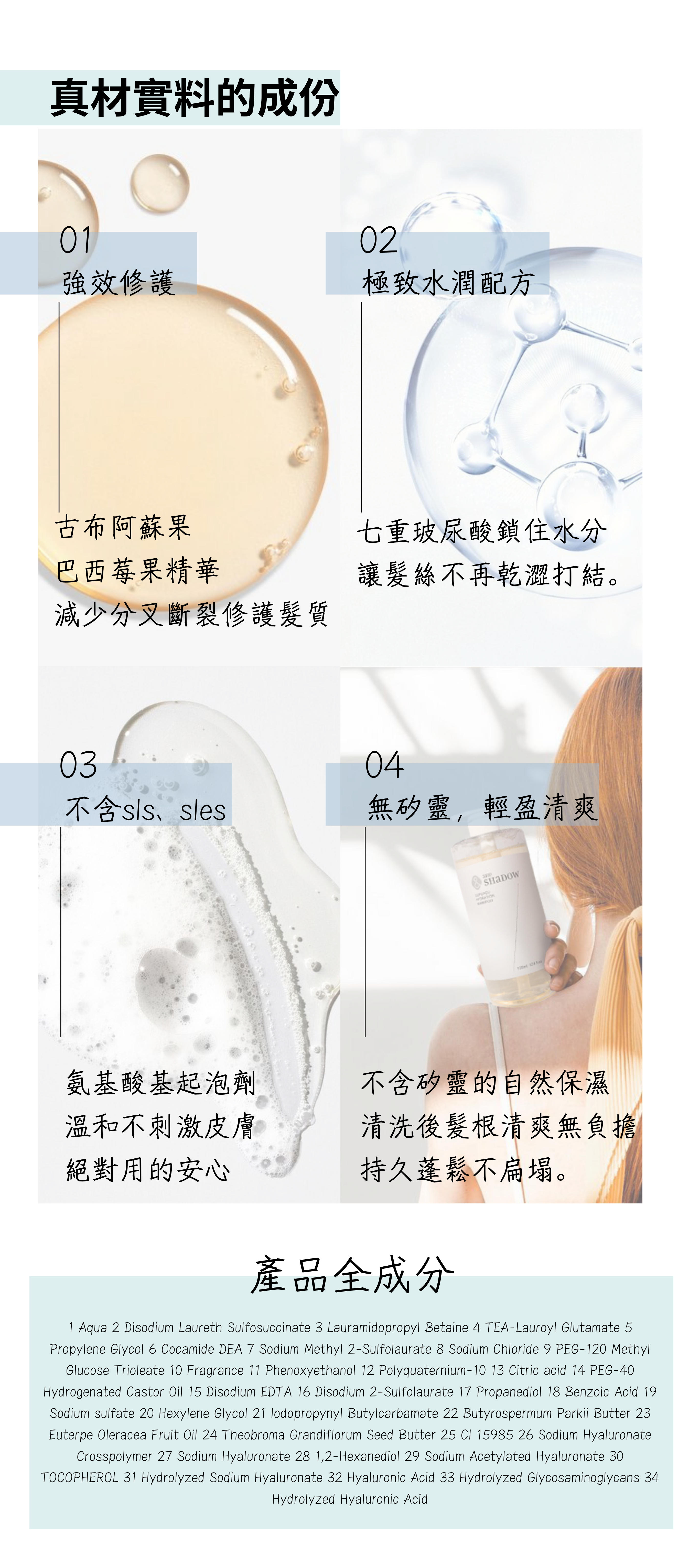 專為乾燥易打結受損髮質設計的保濕修護洗髮精,內含珍貴古布阿蘇果成份、有機巴西莓果、乳油木果及高保濕七重玻尿酸,為髮絲提供真正的保濕效果,不再只停留在表面;無硫酸鹽、不含矽靈成分,溫和清潔頭皮無負擔,同時深層保濕修護髮絲,使秀髮光澤柔順。